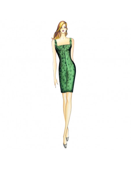 Eng anliegendes Kleid mit Bustier-Mieder, das mit einem Reißverschluss geschlossen und mit Trägern gehalten wird, und einem langen Rock aus Chiffon oder Voile mit zentralen Schlitz. Er kann auch in einer Mini-Version hergestellt werden. Bluse n. 7110.