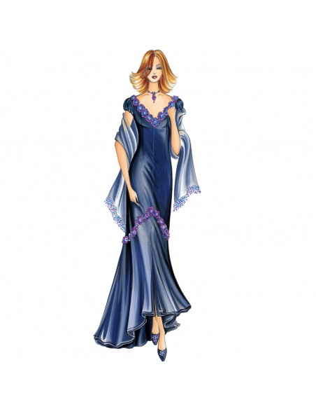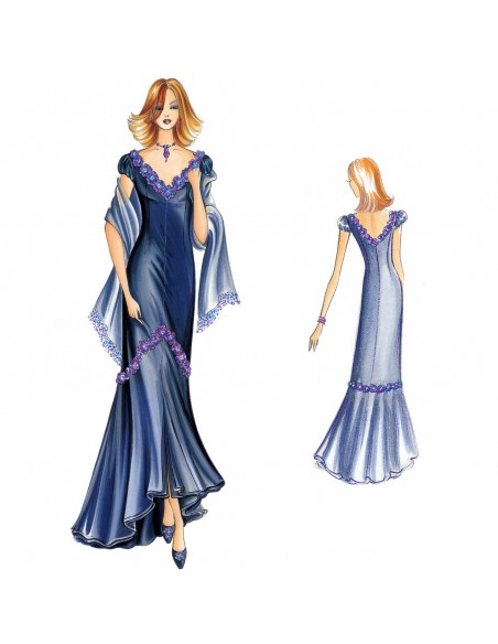 Dieses romantische Kleid hat einen weiten Ausschnitt, der mit Blumen aus Spitze oder Organza verziert ist, kurze Ballonärmel und einen Rock mit doppelten Rüschen. Empfohlener Stoff: Satin oder Chiffon.