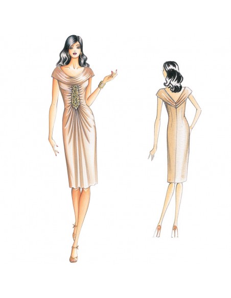 Dieses Kleid hat eine weiche Drapierung, die eine geschmeidige Silhouette erzeugt, Stickereien oder bestickte Spitzenapplikationen und der Kragen endet im Rücken in einem V. Empfohlener Stoff: Crêpe oder Voile.