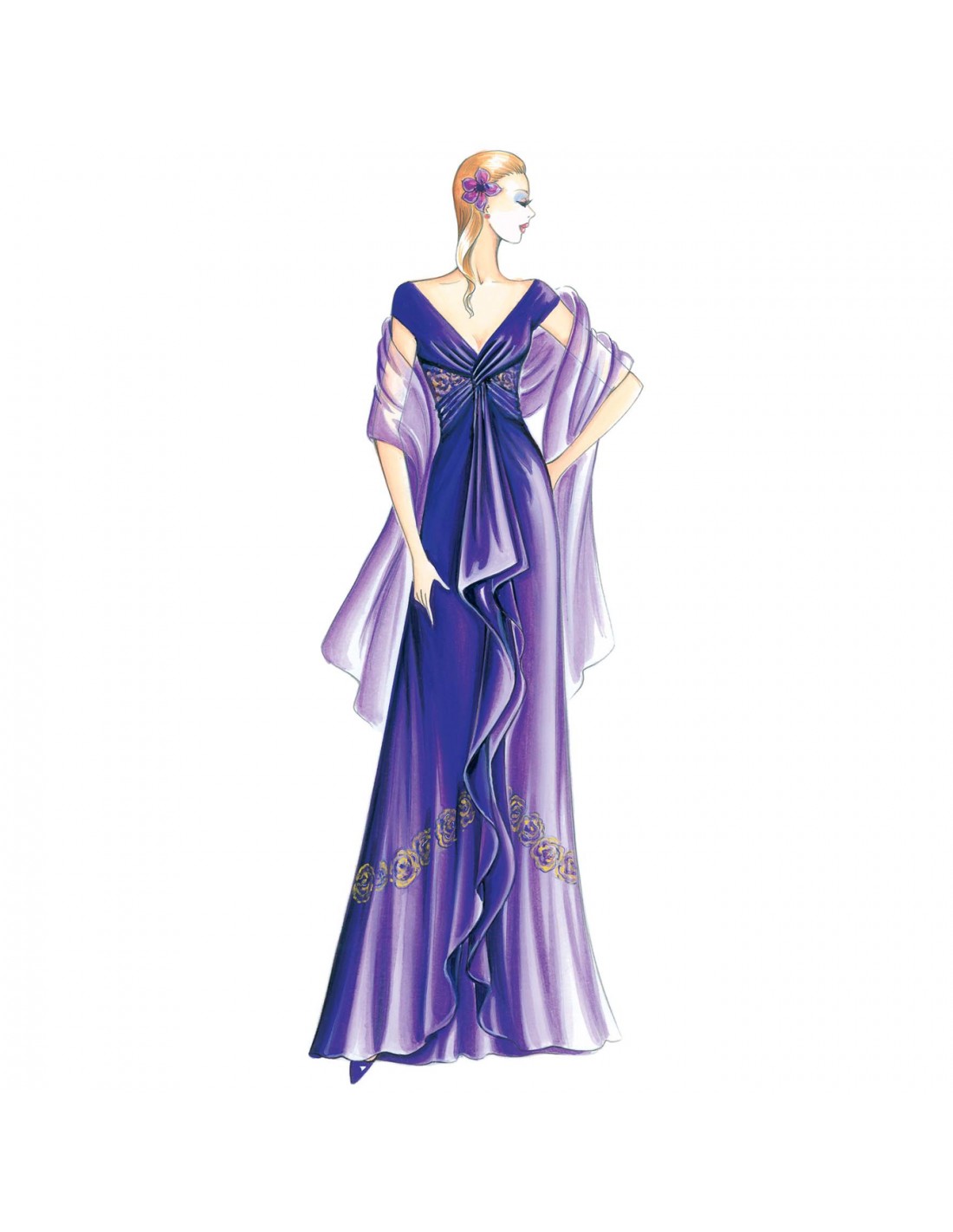 Dieses Kleid hat weiche Drapierungen, die sich über das Mieder, die Spitzeneinsätze und den V-Ausschnitt ziehen. Es hat weiche Rüschen, die in der Mitte des ausgestellten Rocks abfallen und sich am unteren Rand fortsetzen und mit Stickereien oder Applikationen versehen sind. Empfohlener Stoff: Satin, Seidenjersey, Chiffon.
