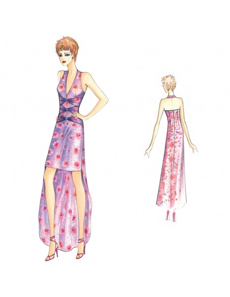 Dieses originelle, figurbetonte Kleid hat Armausschnitte im amerikanischen Stil, das Mieder hat drei geknotete oder geraffte Bänder, die durch Klammern gehalten werden, es hat einen Minirock, der seitlich am Rücken verlängert ist. Empfohlener Stoff: Organzine, Musselin, Satin.
