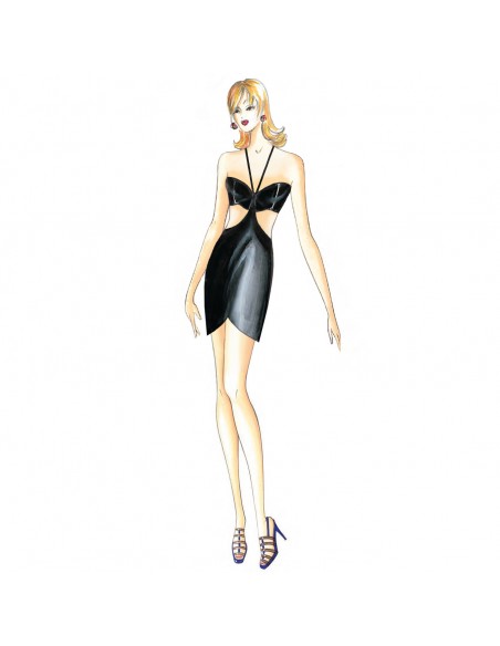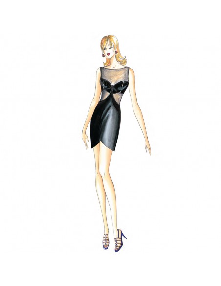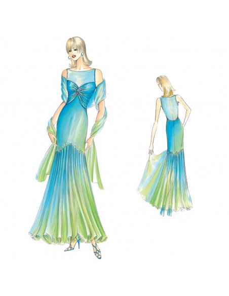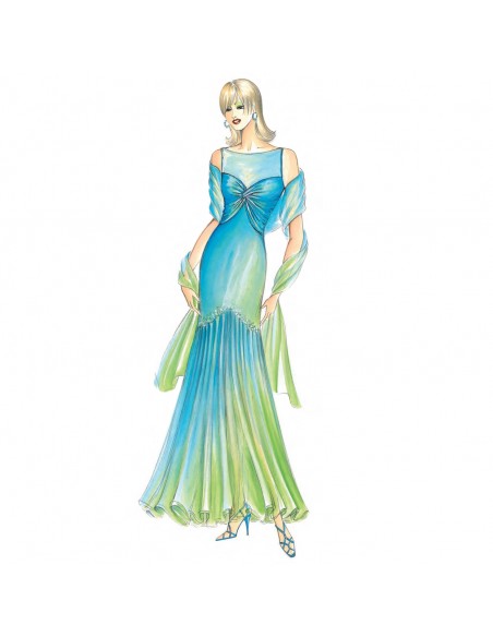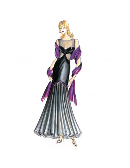 Vintage-Reminiszenz an die 1930er Jahre für dieses Kleid, das in zwei Versionen hergestellt werden kann: mit oder ohne drapiertes Mieder und mit mehreren Lagen gerafftem Rocksaum. Empfohlener Stoff: Musselin und Satin, Organdie mit Tüll.