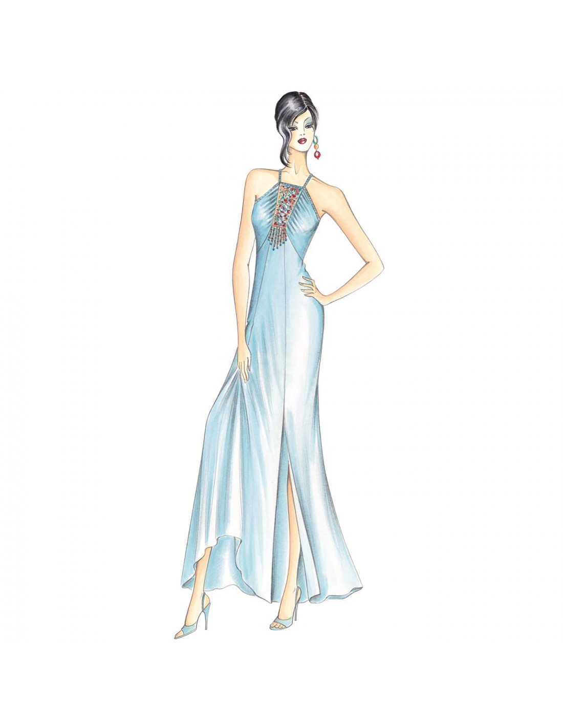 Dieses Slip-Kleid hat einen breiten Mittelteil, der von Trägern gehalten wird, und zwei schräge Bahnen, die an den Seiten gerafft sind. Der Rock ist in Bahnen mit Seitenschlitzen unterteilt. Empfohlener Stoff: Jersey, Crêpe oder Satin mit Organza für die Krawatte.