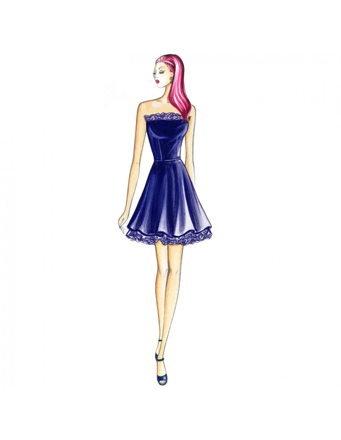 Bei dem Minikleid mit Bustier-Mieder und Godetrock mit Unterrock verlaufen zarte Rüschen entlang des Saums und des Dekolletés. Empfohlener Stoff: Krepp, Taft oder Duchesse-Satin mit Chantilly-Spitzenbesatz.