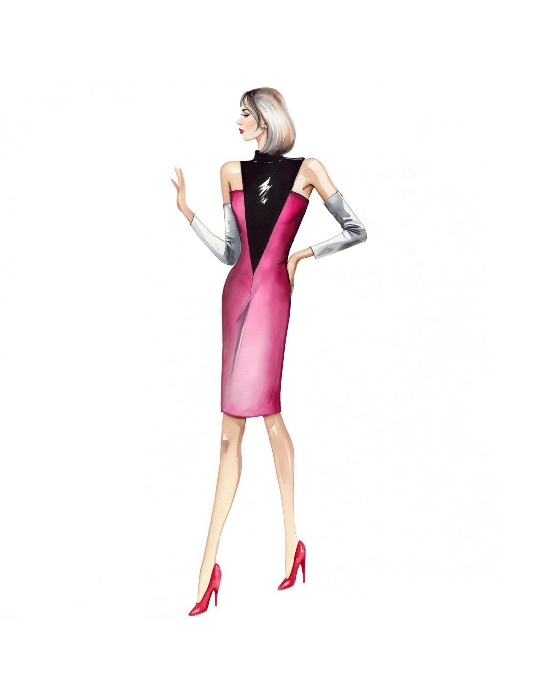 Abendkleid aus Taft oder Spitze mit dreieckigem Plastron aus Samt und Stehkragen.