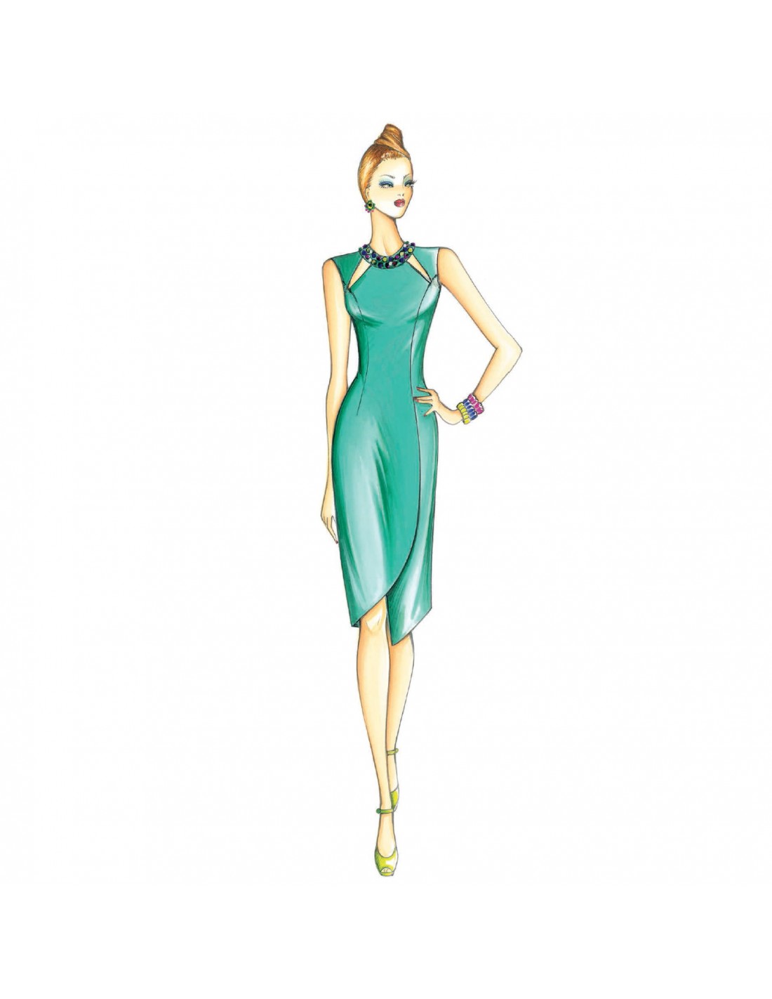 Gerade geschnittenes Kleid mit Schlitzmotiv im Mieder und Rundausschnitt mit farbigen Perlen, Rock mit abgerundetem Saum und verlängerter Spitze. Als Stoff wird Satin und Samt empfohlen.