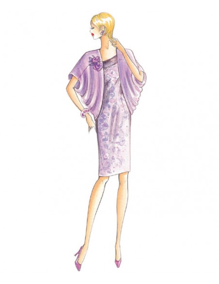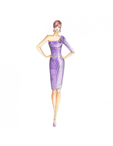 This sheath dress has a single bare satin shoulder, neckline with bow and strass buckle. Suggested fabric: lace or print fabric. Cardigan no. 2147.