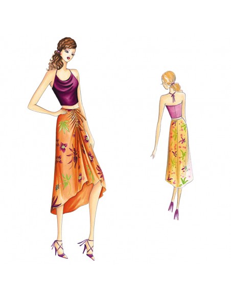 Dieses Outfit besteht aus einem Oberteil im amerikanischen Stil mit einem Kapuzenmotiv am Halsausschnitt. Der Saum des ausgestellten Rocks fällt hinten ab, und die weiche Drapierung in der Mitte erzeugt einen Blouson-Effekt. Empfohlener Stoff: Baumwoll- oder Viskose-Jersey, Georgette, Viskose-Challis.