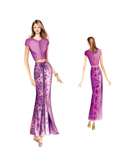 Orientalisch inspiriertes Kleidungsstück, bestehend aus einem Oberteil und einer Rockhose, die in der Taille durch einen Gummizug mit überlappenden, wie ein Sarong geknoteten Bahnen befestigt wird. Kann aus weichem Voile oder gemustertem Stoff hergestellt werden.