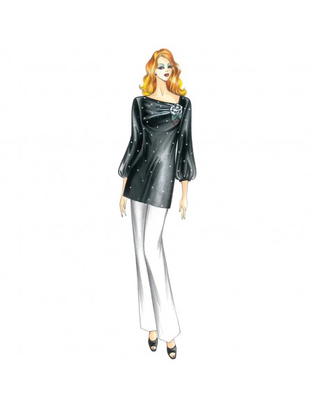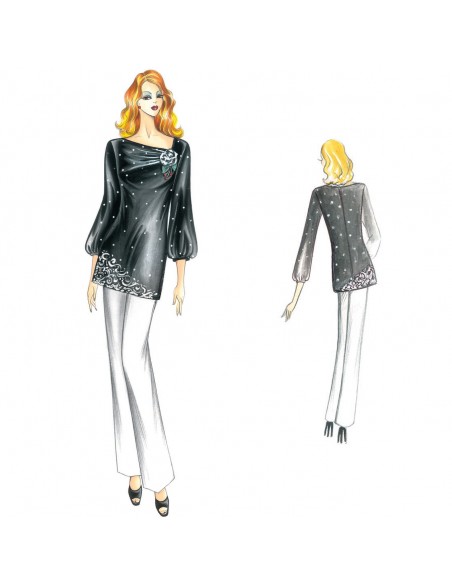 Diese elegante Tunika hat einen drapierten Kragen, hemdartig geraffte Ärmel, eine Rose aus demselben Stoff und eine diagonal angebrachte Stickerei.