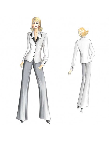 This somewhat form-fitting blouse has an original collar that overlaps the lapels. Suggested fabric: two-tone fabric. Pants no. 9443.
