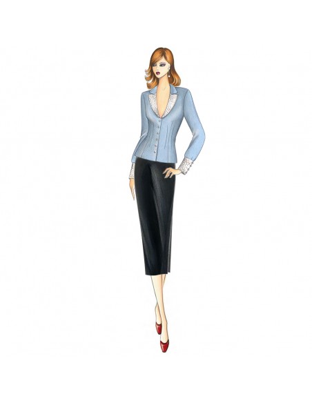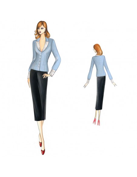 Diese figurbetonte Tunika wird mit kleinen Knöpfen geschlossen. Sie hat dreifache Abnäher auf der Vorderseite, einen Kragen mit kleinen, spitz zulaufenden Revers und breite, mit Pailletten verzierte Manschetten. Empfohlener Stoff: Crêpe de Chine oder marokkanischer Crêpe, Georgette, Charmeuse-Satin, leichter Denim.