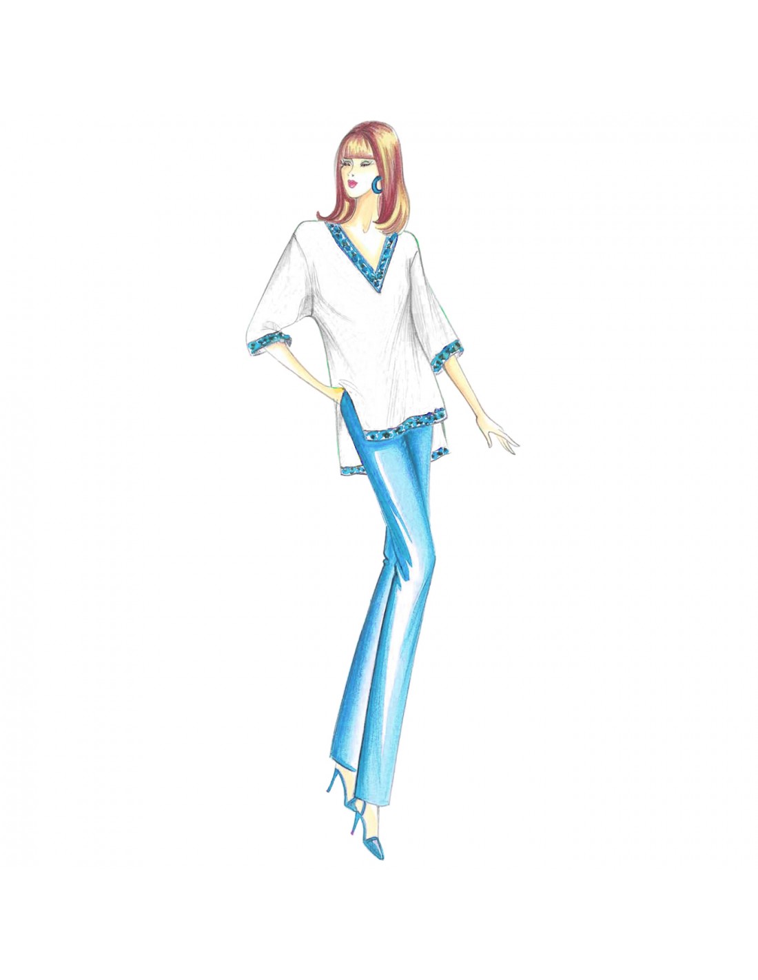 Diese gerade Bluse hat weite ¾-Ärmel, einen hinten verlängerten Saum und Seitenschlitze. Sie hat einen V-Ausschnitt und die Manschetten und der Saum sind mit Stickereien und Steinperlen besetzt.