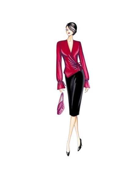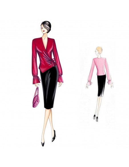 Doppelt gekreuzte Bluse mit modellierter, seitlich drapierter Linie, die mit einem Band geschlossen wird, asymmetrischem Saum und weichen Ärmeln, die an den Manschetten mit einem Kordelzug gerafft sind, der Rüschen erzeugt. Empfohlene Stoffe: Crépe de Chine, Jersey oder Chiffon.
