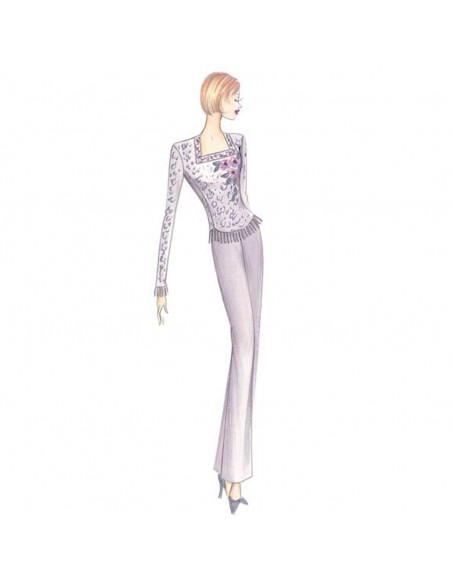 Diese figurbetonte Bluse hat einen quadratischen, bestickten Ausschnitt und einen abgerundeten Saum mit Fransen. Empfohlener Stoff: bedruckter Jersey oder Spitze. Mantel n. 8418.