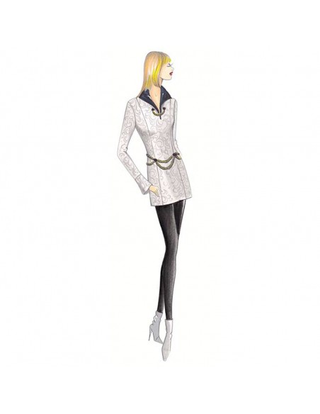 Diese figurbetonte Tunika hat einen langen, spitzen Kragen, der sich im Polostil öffnen und mit einem Frosch schließen lässt. Die Ärmel haben runde Armausschnitte und Volants mit Schlitzen an den Manschetten. Empfohlener Stoff: bestickter Crêpe, leichter Damast, Lurex-Jersey und Devoré- oder Froissé-Samt.