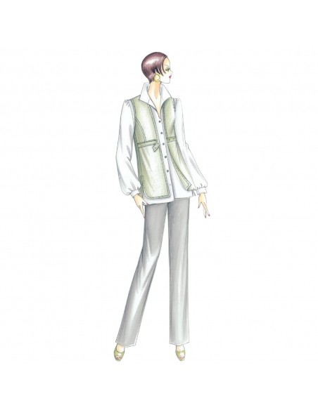 This semi-straight blouse has an empire cut at the side to hold slight gathers. The sleeves are gathered at both cuffs and shoulders. Suggested fabric: batiste, organza or muslin. Vest 2510.