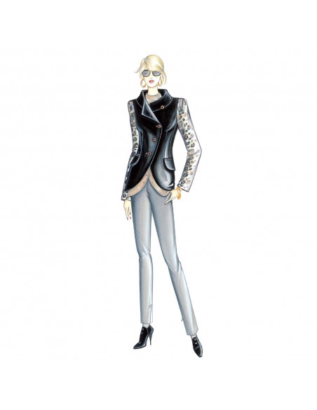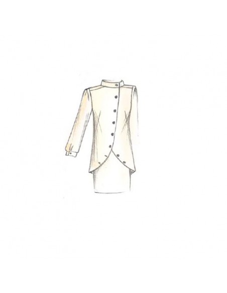 This form-fitting blouse has an oblique closure and rounded hemline fraught with buttons and buttonholes. It has a standup collar and the sleeves are gathered at the cuffs and shaped by darts at the shoulders. Suggested fabric: jersey.