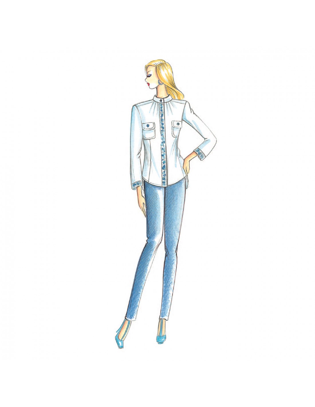 Bluse mit Manschettenkragen, der kleine Falten am Rundausschnitt festhält, gestickter oder in Seide eingefasster Stützrand, auf der Rückseite verlängerter abgerundeter Saum.