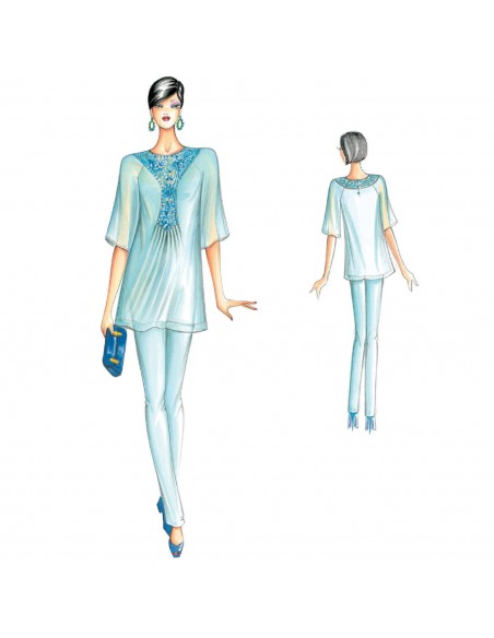 Kasack, auszuführen in Voile oder Stretch-Tüll, modelliertes Carrè in gestickter Spitze.