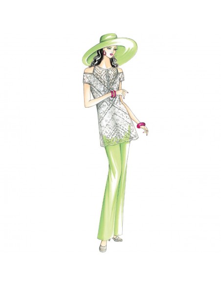 Long blouse with crew-neck, inner pocket and exposed shoulders. To be made in multi-coloured cotton or Sangallo lace.