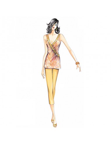 This blouse is secured at the waistline with a leather belt. The collar has side buttons and the sleeves are gathered at the shoulders. Suggested fabric: striped satin or jersey.
