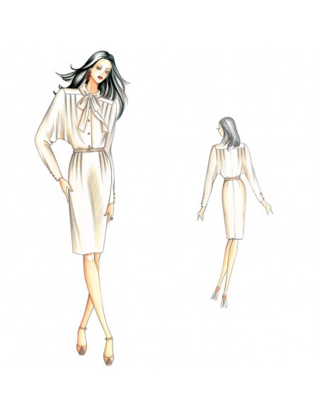 This shirt-waist dress has kimono sleeves, a strip collar, yoke that holds pleats or gathers and straight skirt softened by pleats. Suggested fabric: jersey, crêpe de chine, cady or chiffon. Hose n. 2975.