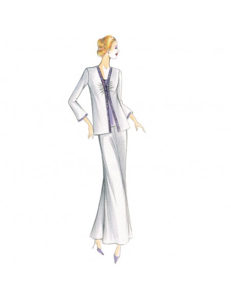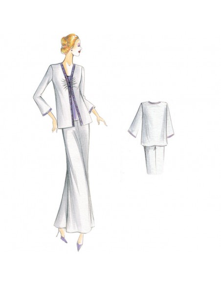 Diese Strickjacke wird von Kante zu Kante geschlossen und ist mit einer Stickerei verziert; eine Empire-Taille sichert die lockeren Falten. Empfohlener Stoff: Chiffon oder Satin.
