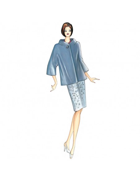 Ausgestellte Strickjacke mit weiten ¾-Kimonoärmeln und Kragen. Vorgeschlagen aus: Doppel-Crêpe oder Jersey.