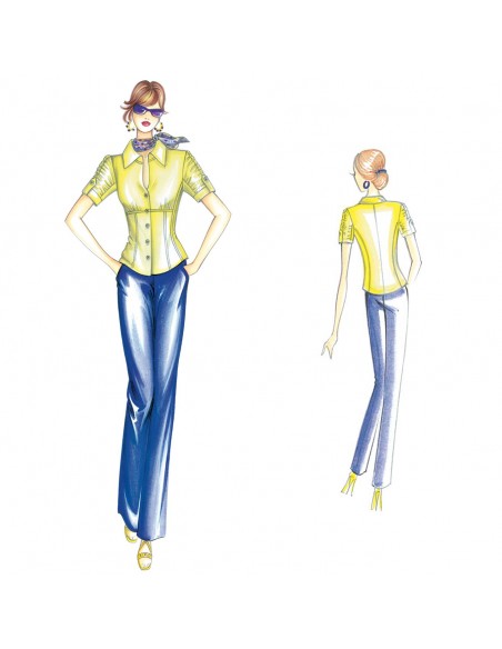 Diese figurbetonte Bluse erzeugt einen Korsett-Effekt mit Empire-Taille, die den eng anliegenden Teil von dem darüber liegenden blusigen Teil trennt. Die originellen kurzen Ärmel haben eine Raffung, die über die gesamte Länge des Ärmels verläuft, und sind an den Manschetten mit Streifen versehen. Empfohlener Stoff: Batist oder Musselin.