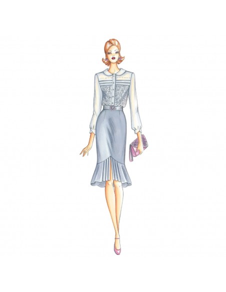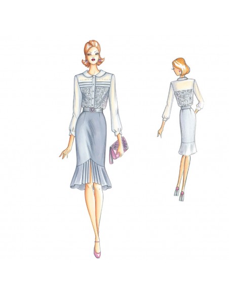 Sehr raffinierte Bluse, auszuführen in Voile oder Musselin und Spitze, Babykragen und Carrè mit Bügelfalten. Kombinierbar mit dem Rock 3071.
