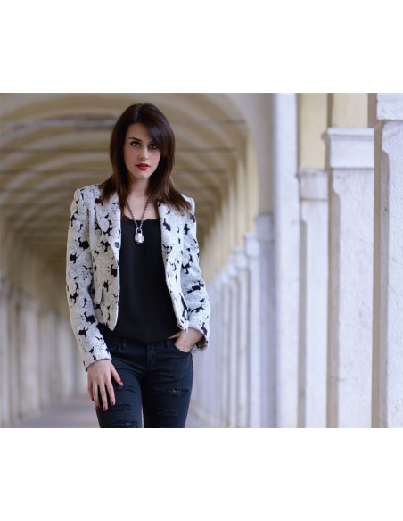 Spencer-Jacke in modellierter Linie mit Sportkragen und in Richtung der Hüfte gesetzte Taschenklappen an der Taille . Empfohlene Stoffe: bedruckter oder glatter Samt, Woll-Jacquard, Phantasiestoff, leichte Wolle, Krepp.