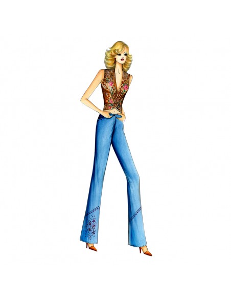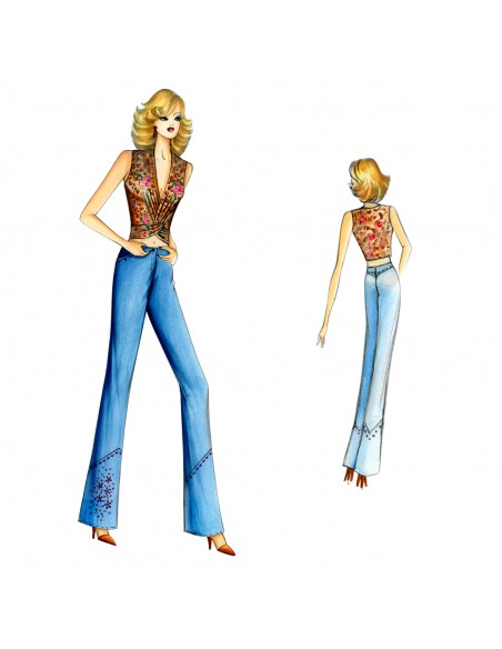 Leicht ausgestellte Hose, Taschen und unteres Bein mit Nietenmotiv. Oberteil n. 7111.