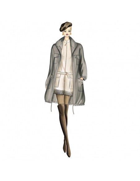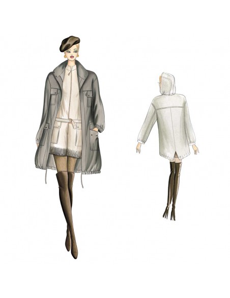 Dieser einreihige Parka im Military-Look hat einen verdeckten Reißverschluss, einen Ringkragen, eine abnehmbare Kapuze mit Streifen, Ärmel mit überschnittenen Armlöchern und gerafften Bündchen, aufgesetzte Taschen mit Patte und Reißverschluss sowie einen Tunnelzug im Bund. Empfohlener Stoff: verschmierter Technostoff, Baumwolle, Satin oder gewaschene Seide mit Innenwattierung. Jumpsuit n. 6699.