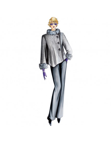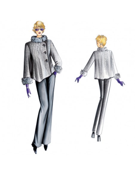 Diese Jacke in A-Linie hat einen versetzten Ringkragen, der seitlich mit drei Knöpfen geschlossen wird, und einen asymmetrischen Saum mit rohem Schnitt. Empfohlener Stoff: gezwirnte Wolle.