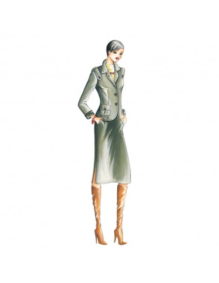This jacket has epaulets secured by buttons and a yoke cut at the back. The sleeves have turned up knit cuffs. Suggested fabric: vicuna.