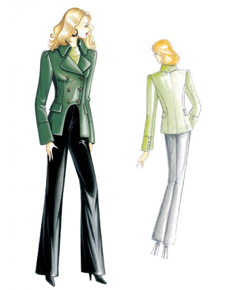This jacket is a throw-back to the 18th century with double wrap closure with arched opening at the bottom. It has a Danton collar and the sleeves are slightly gathered at the shoulders and cuffs.