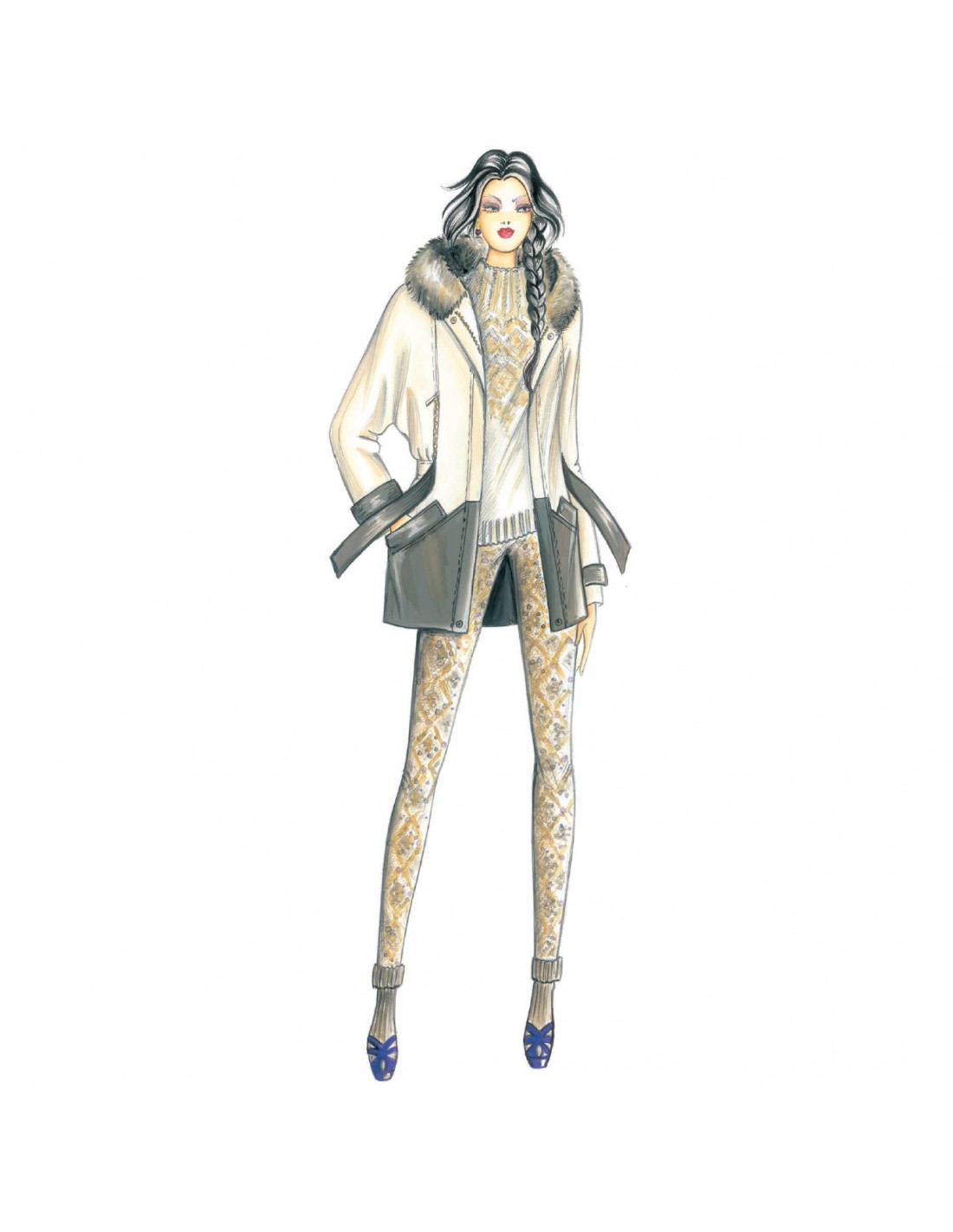Jacke mit bequemen Kimono-Ärmeln und auf dem Rücken eingesetzter und wie bei einem Hausmantel verknoteter Gürtel, Ringkragen und Innentaschen. Als Stoff wird Bouclé-Wolle, gekämmte Double-Face-Wolle oder Tweed empfohlen.