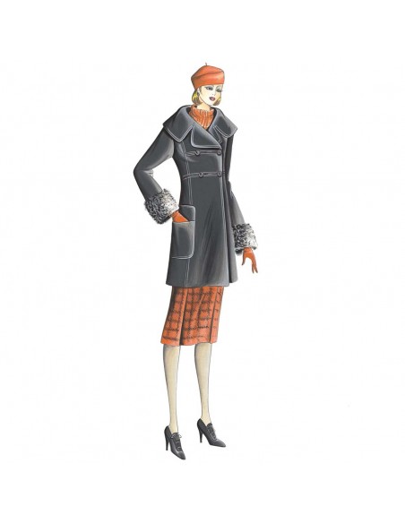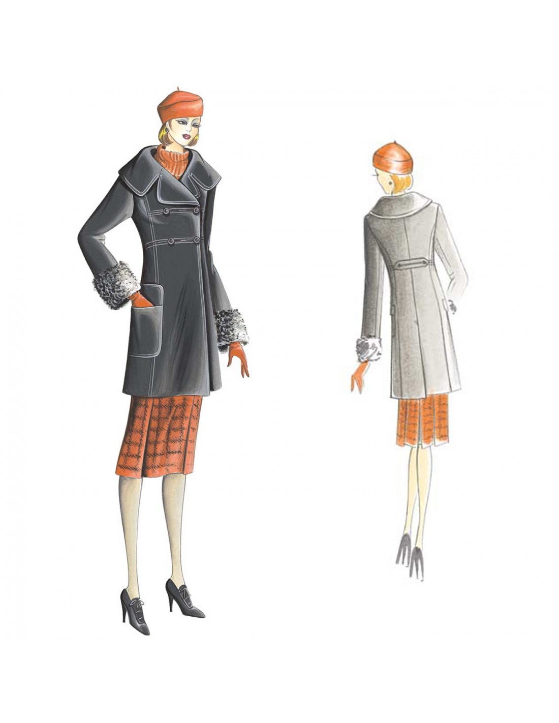 This form-fitting jacket is flared at the bottom and has an empire waistline. It has a high doublebreasted closure, a broad offset collar that frames the shoulders and patch pockets with flaps. Suggested fabric: woven fabric, tweed, boiled wool. Skirt n. 1021.