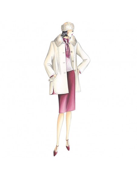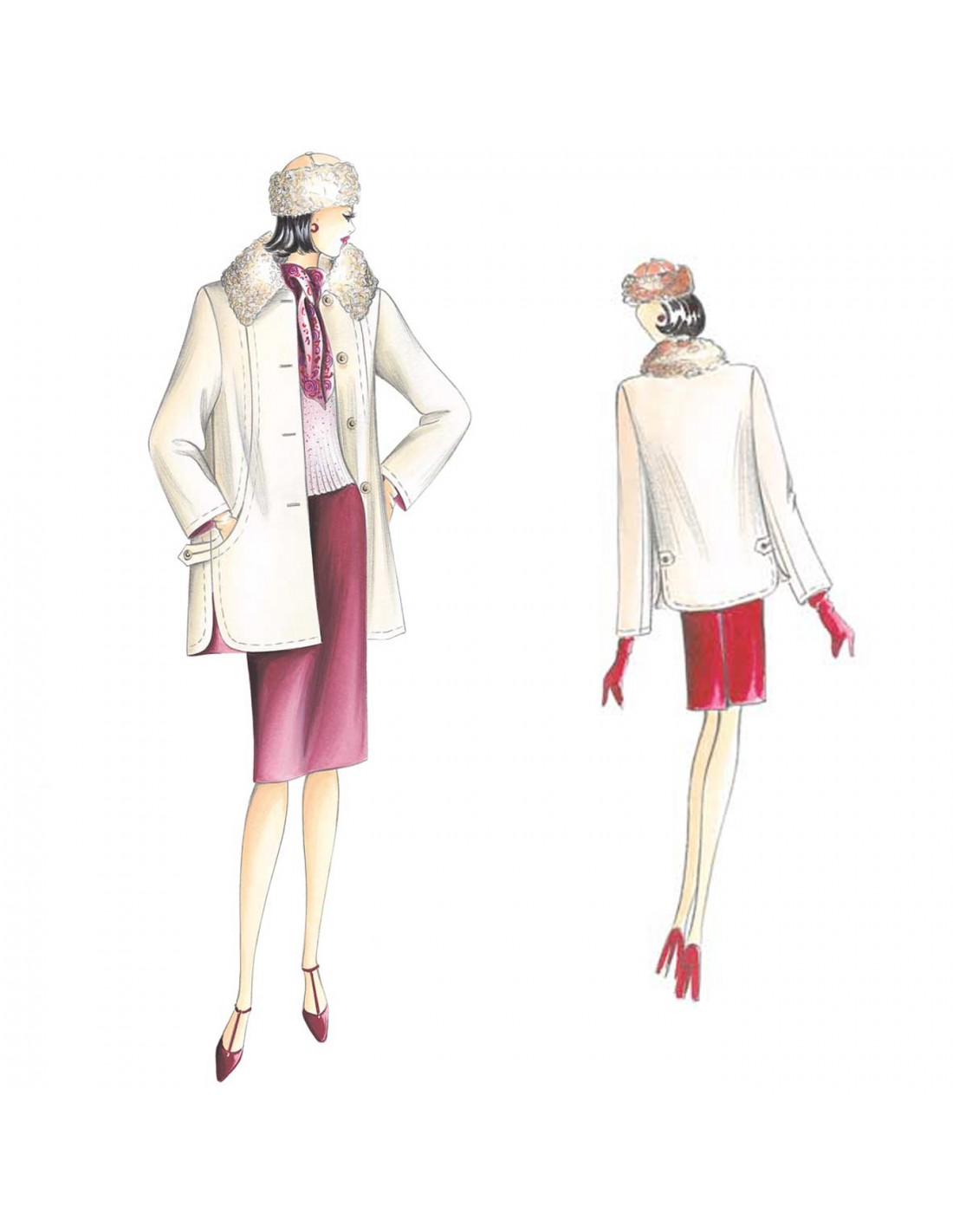 This straight single-breasted jacket has rounded cuts that end at the side. It is secured by strips and has inserted internal pockets, side slits and collar. Suggested fabric: woven fabric or velour with astrakhan trim for the collar.