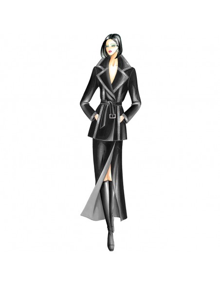 Diese Jacke hat einen doppelten Überschlag, der mit einem Gürtel und verdeckten Knöpfen geschlossen wird. Der breite, sportliche Kragen, die Schnitte und die Manschetten sind mit Leder eingefasst. Empfohlener Stoff: Velours, Kaschmir, behandelte Wolle oder Tweed. Rock n. 8477.