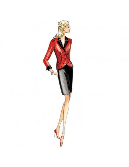 Diese figurbetonte Jacke hat gewölbte Schnitte, die für leichte Raffungen sorgen. Sie hat Hemdsärmel im Herrenstil und umgeschlagene Manschetten. Empfohlener Stoff: Jacquard-Satin. Kleid n. 1848
