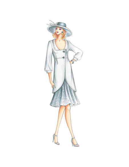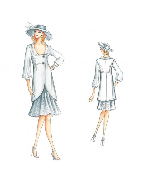 Diese lange Jacke in A-Linie hat einen abgesetzten Kragen, eine erhöhte Taille und lässt sich mit zwei oder drei Knöpfen schließen. Empfohlener Stoff: Leinen, Satin oder Crêpe.