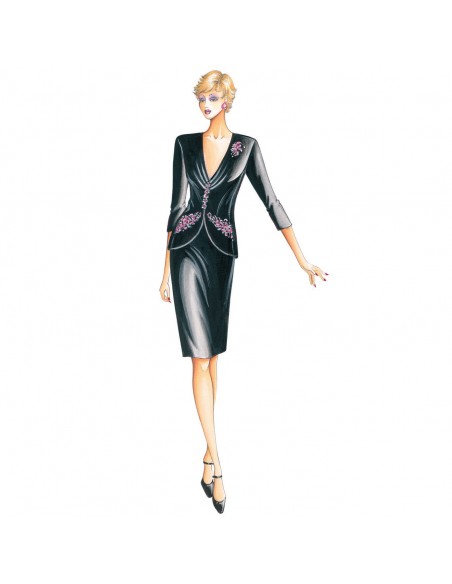 Diese figurbetonte Jacke hat einen V-Ausschnitt und weiche Falten. Empfohlener Stoff: Crêpe oder Samt.
