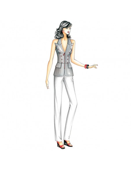 Diese Jacke hat kleine Knöpfe, die rot sind wie der Reißverschluss. Empfohlener Stoff: Nadelstreif oder weißes Leinen. Hose n. 2761.