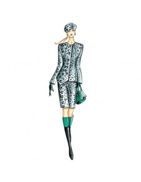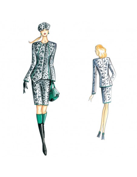 Kragenlose, taillierte Jacke mit asymmetrischem, spitz zulaufendem Saum und Lederpaspeln an den Nähten. Empfohlener Stoff: Tweed oder bedruckter Stoff mit Spitzenwolle oder Makramee-Applikationen.