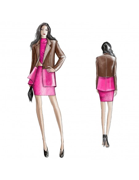 Zweifarbiger Effekt für den halbgeraden einreihigen Blazer mit klassischem Reverskragen und horizontalem Schnitt, in den die Innentasche passt. Empfohlene Stoffe: Vikunja, leichter Stoff, Krepp.