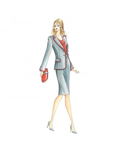 Diese figurbetonte, zweireihige Jacke hat einen sportlichen Kragen, hängende Ärmel und eingesetzte Taschen mit Klappen. Empfohlener Stoff: Nadelstreifen, leichte Wolle oder Vikunja.