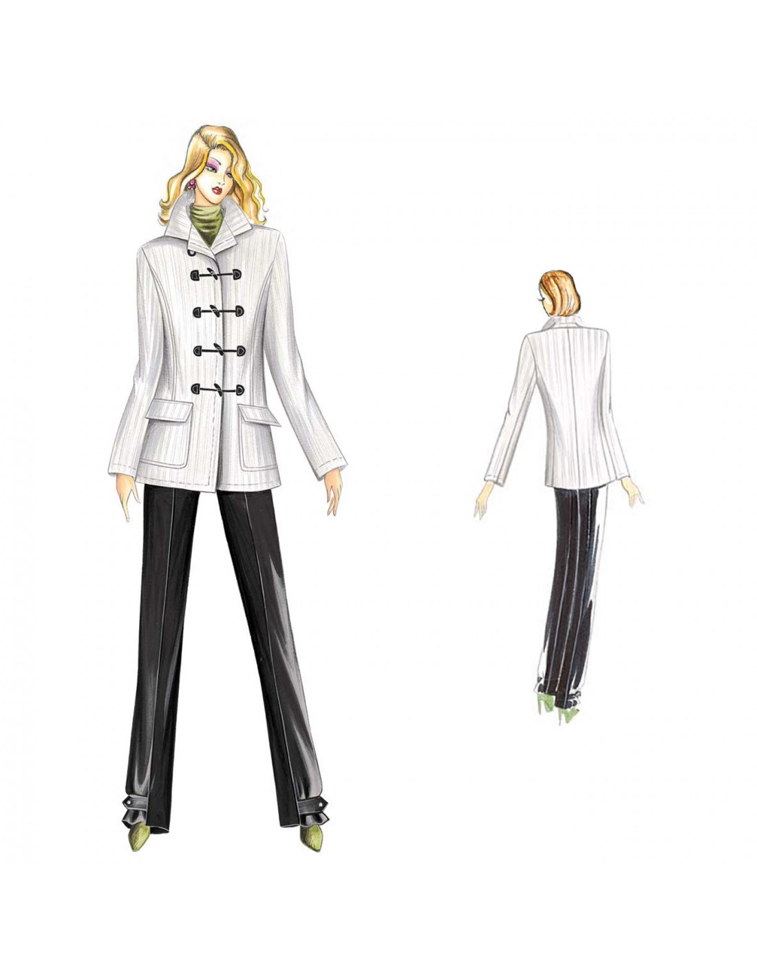 Diese etwas lockere Jacke wird mit Lederfröschen und Druckknöpfen geschlossen, die von einem hemdartigen Kragen verdeckt werden. Sie hat aufgesetzte Taschen mit Klappen. Empfohlener Stoff: Kord, Tartan, Loden oder Filz mit größerer Leibung.