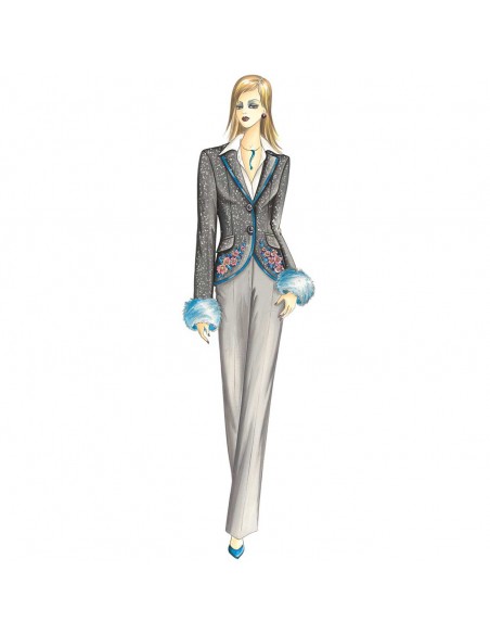 This youthful jacket has a sporty collar, rounded hemline and wool embroidery under the flaps. Skirt n. 9633.